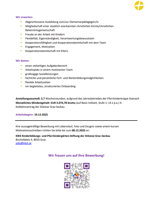 Anstellungsausmaß: 5,7 Wochenstunden, aufgrund des Jahresbetriebes der Pfarrkinderkrippe Stainach Monatliches Mindestgehalt: EUR 3.074,78 brutto (auf Basis Vollzeit, Stufe 1; 14 x p.a.) lt. Kollektivvertrag der Diözese Graz-Seckau.