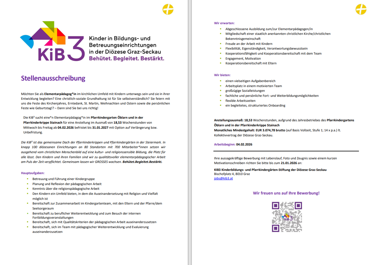 Die KiB³ sucht eine:n Elementarpädagog:in für die Pfarrkinderkrippe Stainachund den Pfarrkindergarten Öblarn für eine Anstellung im Ausmaß von 18,53 Wochenstunden von Mittwoch bis Freitag ab 04.02.2026 befristet bis 31.01.2027 mit Option auf Verlängerung bzw. Unbefristung.