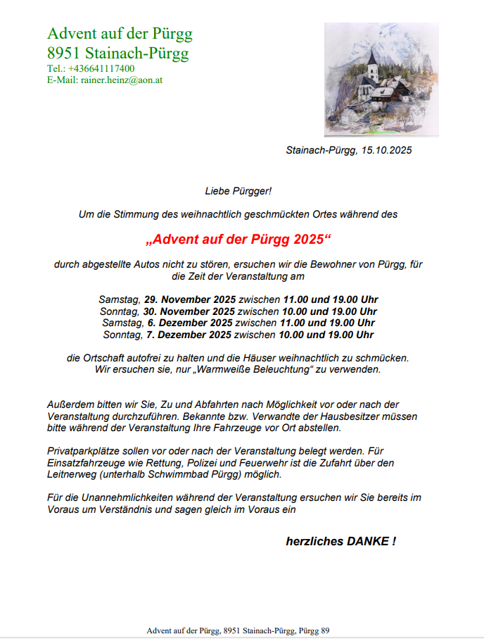 durch abgestellte Autos nicht zu stören, ersuchen wir die Bewohner von Pürgg, für die Zeit der Veranstaltung am