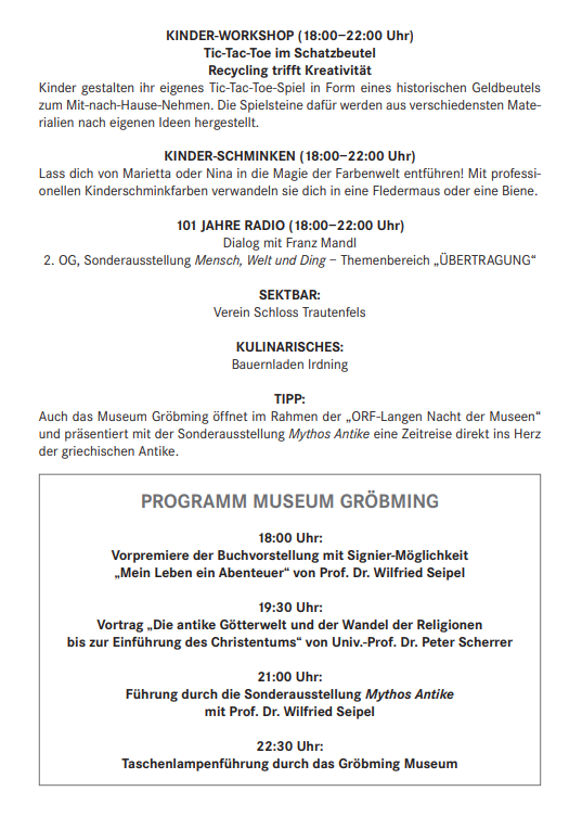 Das Programm steht im Zeichen der Sonderausstellungen Mensch, Welt und Ding und Signal vom Dachstein.