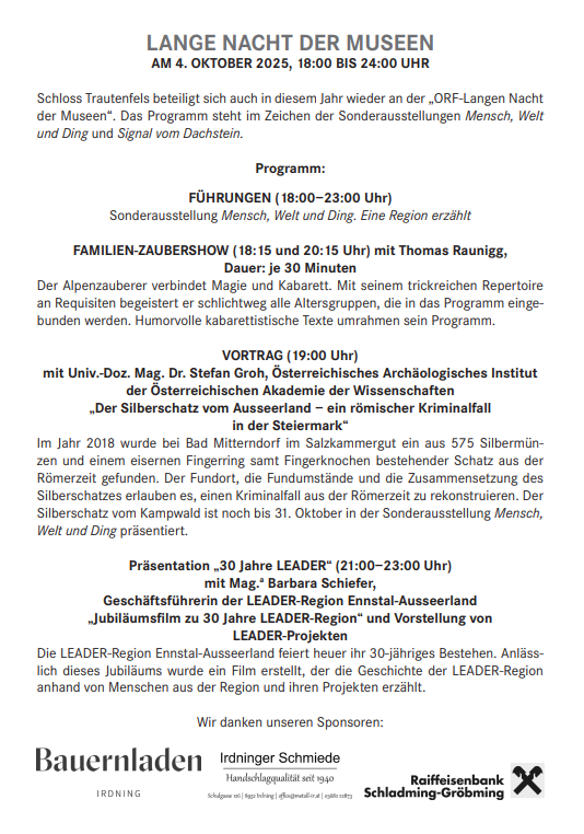 Das Schloss Trautenfels beteiligt sich auch in diesem Jahr an der "ORF-Langen Nacht der Museen".