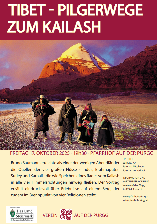 Sutley und Karnali - die wie Speichen eines Rades vom Kailash in alle vier Himmelsrichtungen hinweg fließen. Der Vortrag erzählt eindrucksvoll über Erlebnisse auf einem Berg, der zudem im Brennpunkt v on vier Religionen steht.