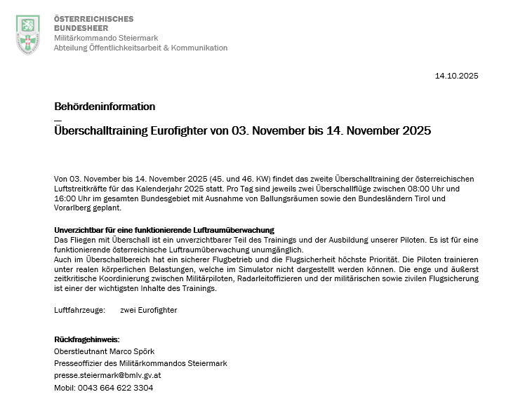 Von 03. November bis 14. November 2025 (45. und 46. KW) findet das zweite Überschalltraining der österreichischen Luftstreitkräfte für das Kalenderjahr 2025 statt. Pro Tag sind jeweils zwei Überschallflüge zwischen 08:00 Uhr und 16:00 Uhr im gesamten Bundesgebiet mit Ausnahme von Ballungsräumen sowie den Bundesländern Tirol und Vorarlberg geplant.