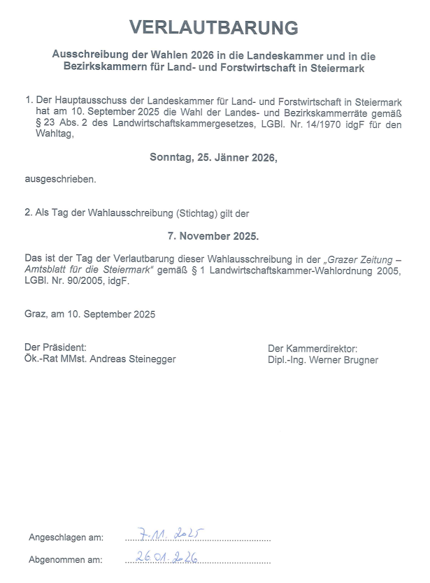VERLAUTBARUNG AUSSCHREIBUNG DER WAHLEN 2026