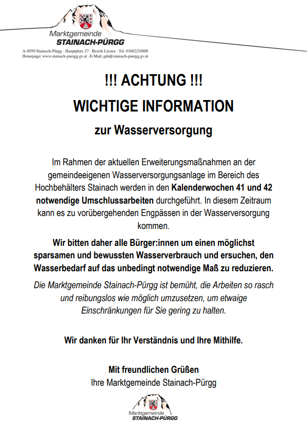 Im Rahmen der aktuellen Erweiterungsmaßnahmen an der gemeindeeigenen Wasserversorgungsanlage im Bereich des Hochbehälters Stainach werden in den Kalenderwochen 41 und 42 notwendige Umschlussarbeiten durchgeführt.